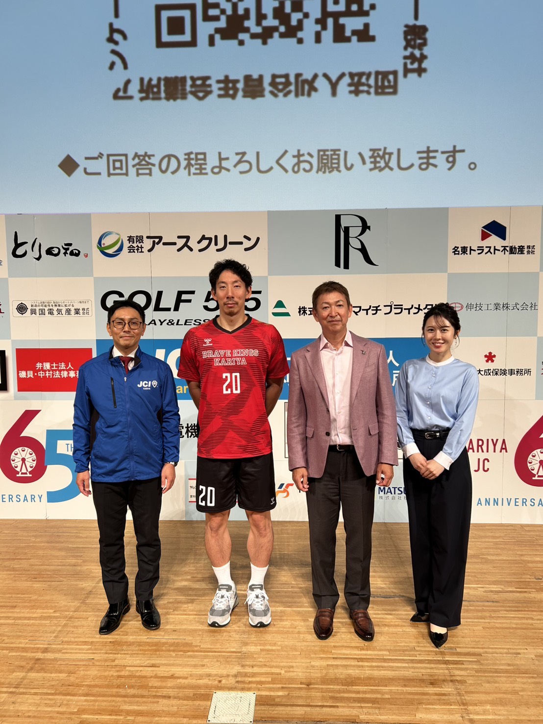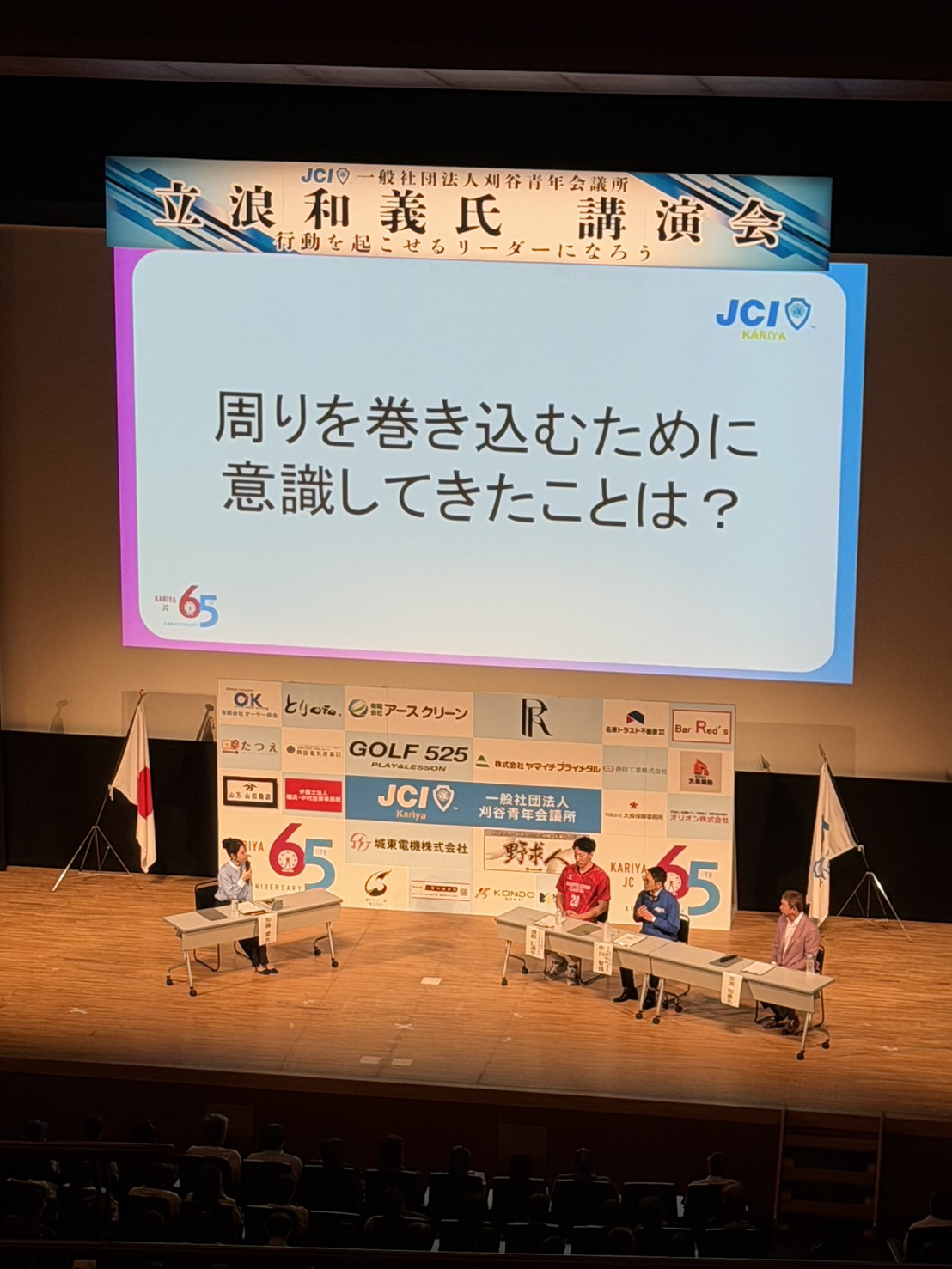 2025年10月20(月)刈谷総合文化センター大ホールにて、65周年委員会による10月例会を開催いたしました。10月例会は「恐れず踏み出そう!乗せるぞ上昇氣竜!」をテーマに自分自身も考えて行動する力を身につけていただくことを目的し、中日ドラゴンズ元監督立浪和義氏を講師としてお招きし、フリーアナウンサー加藤愛氏を司会進行役として講演を実施いたしました。立浪氏の講演後は立浪氏とトヨタ車体ブレイヴキングス北詰選手と中川理事長の3名に考えを行動に移すことの大切さなどをパネルディスカッションしていただきました。当日は多くの来場者のお越しいただくことができました。